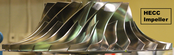 This high pressure ratio compressor stage includes a centrifugal impeller with splitters, followed by a split radial diffuser. After the splitters, there is a 90 degree turn in the flow path followed by an axial vaned diffuser. This is pictured below in Figure 1. Figure 2 shows the HECC compressor geometry manufactured for testing.