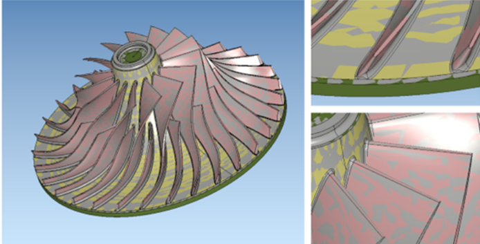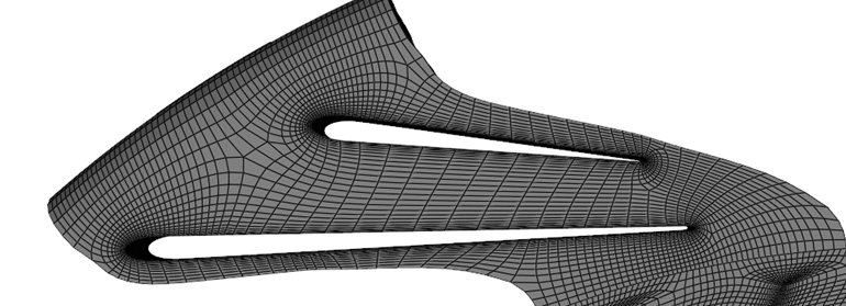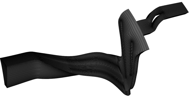 The TurboTides automated mesher integrated into the CFD module was used to produce a mesh with 1,109,024 cells. The mesh included the clearance region. Figures 4 through 8 show the mesh used for this study. It is relatively coarse; however, its size is well aligned with the everyday design environment where engineers use similar-quality meshes for quick design iterations. Higher-fidelity CFD using finer meshes may be used in later design phases to improve accuracy, but that is outside the scope of this case study.