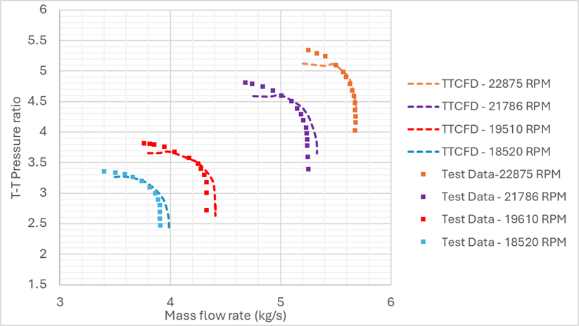 As flow rate is decreased for the higher speed lines, the steady state CFD provides a more conservative prediction of pressure ratio as the compressor reaches stall conditions. Closer to stall, instabilities in the flow can result in some uncertainty for any steady state CFD code. The instabilities in the flow closer to stall are a potential reason for the lower pressure ratio prediction for this steady state simulation. We will continue investigating the discrepancies observed to improve the quality of prediction from TT CFD.