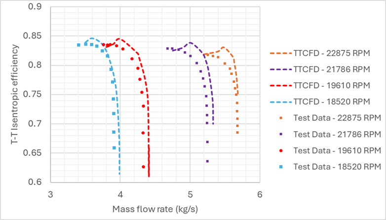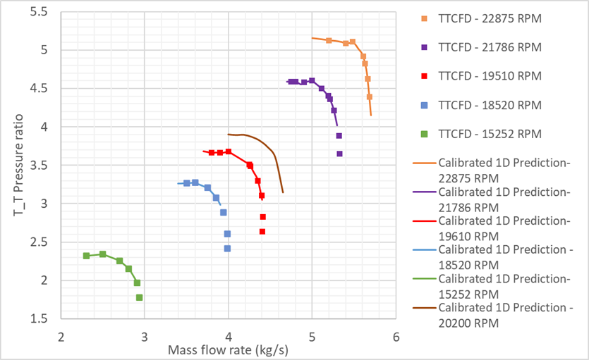 Figure 14 below shows the performance map prediction for the calibrated 1D model, compared to the test data. The 20200 RPM speedline was not run in the CFD simulations, this demonstrates how the calibrated 1D model can be used to accurately interpolate performance at speedlines outside the original performance map.