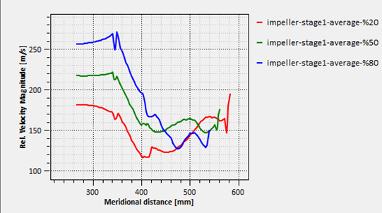 The post-processing options allow for line plots as well as contour, vector and streamline plots to be produced. The user can define custom surfaces on which to project the contours. Below in Figure 11 a contour of relative Mach number shown at the 50% span. Figure 12 shows a line plot displaying the relative velocity magnitude at varying spans from 20 to 80%. For both figures, the RPM was 21786, with a T-S pressure ratio of 4.5.