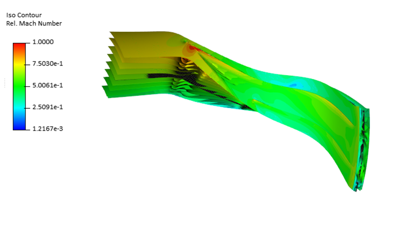 3D iso contours were created at this operating condition to visualize the flow field of impeller. The colormap was set to have Mach number up to 1, a small region of supersonic flow near impeller LE tip is observed, but it's well confined, which may explain in part the good performance of this compressor design.