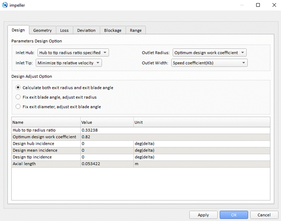 After the preliminary sizing, users can apply desired geometric parameters manually or modify the design rule options from default value or impose constraints if necessary. This includes setting the inlet or outlet radius or width to a specific value, setting the LE or TE blade thickness, number of blades etc. After these are applied, users may create revised designs.