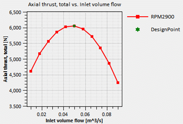 The TurboTides 1D Analysis mode was then used to predict the pump performance at different operation conditions In the analysis mode, users can choose most sophisticated meanline models for pumps available. They are customizable, and may include axial thrust modeling, interstage modeling, cavitation modeling and structural modeling. The analysis mode allows the user to change geometry parameters and see their effect on the performance prediction. Custom parameters and functions can be defined and graphed by the user. The analysis mode includes a multi-point analysis tool that allows for performance maps generation based on RPM, inlet pressure, or IGV angle. The performance map for this design is shown in Figure 3. Figure 4 shows the prediction of axial thrust of these designs.