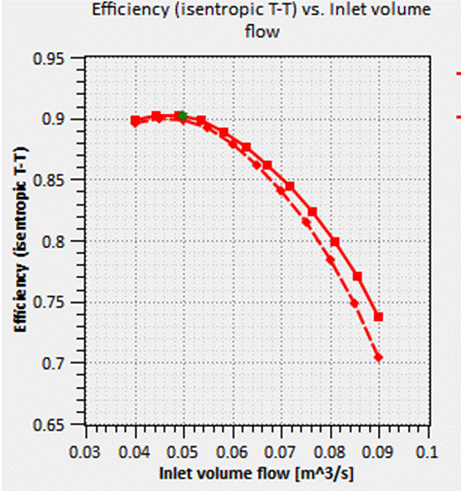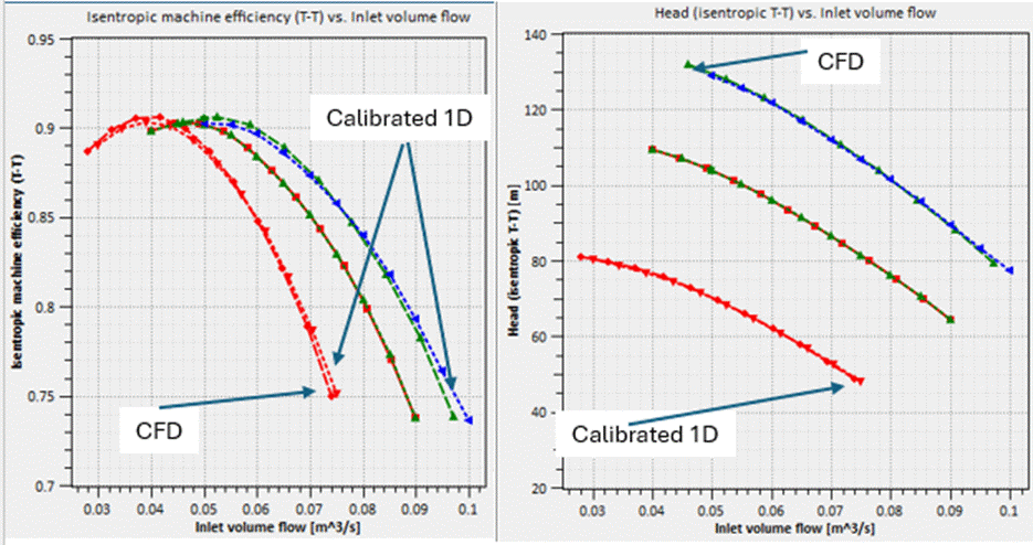 Furthermore, the user can make changes to the model's geometry and the calibrated model will stay accurate, within certain bounds. This means the user can make use of the calibrated1D model to quickly and accurately assess the effect of proposed changes to the design on the performance map.