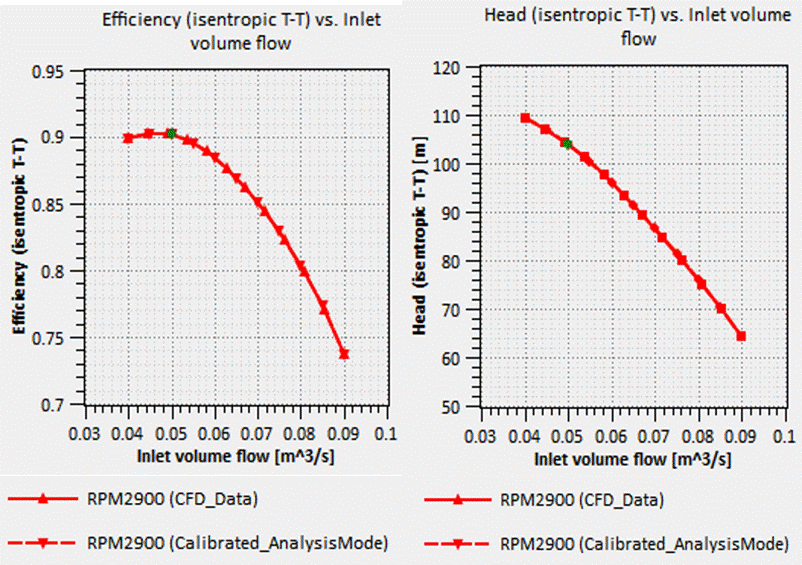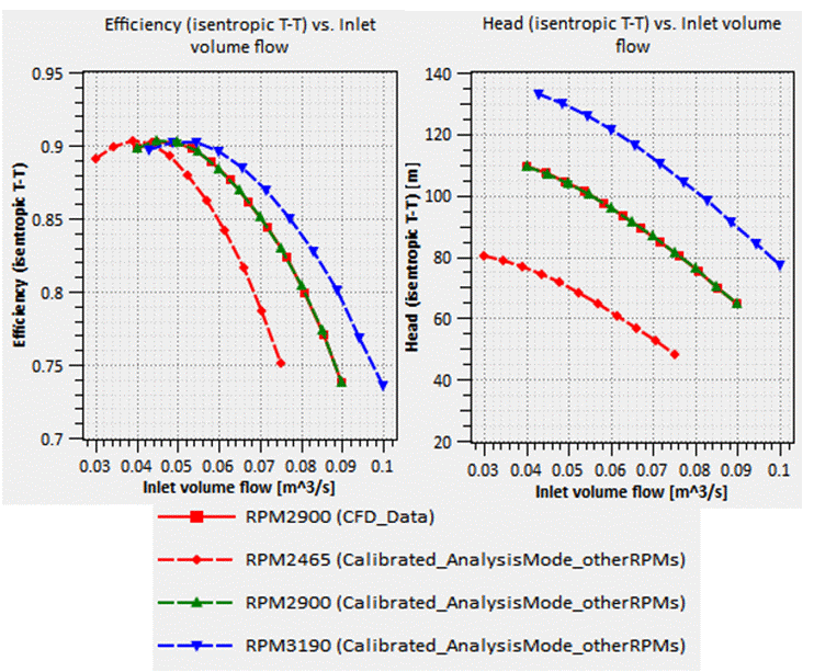 In this case study, after calibrating the 1D model using the CFD data, the 1D analysis mode can be used to make accurate predictions of this machine at conditions outside of the operating conditions in the original performance map, with a different working fluid, or with a modified geometry. The below figure shows the 1D model prediction of performance after calibrating the 1D model with the CFD results. The test data and calibrated analysis mode predictions are almost identical, indicating that the 1D model was then ready to use to accurately predict performance. After this, modifications can then be made to the operating conditions, working fluid, RPM, inlet conditions, and the performance prediction will remain accurate and useful.