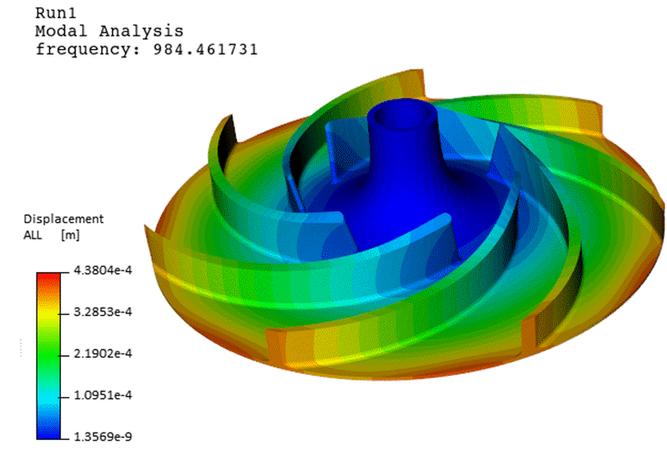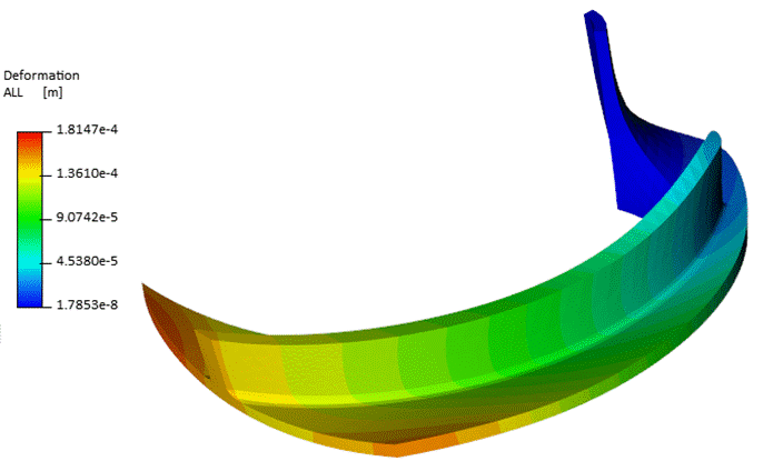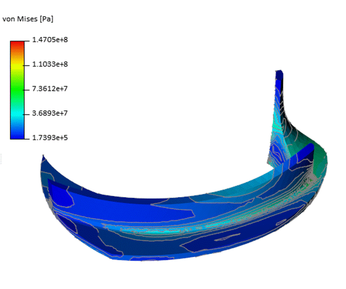 The FEA module within TurboTides functions similarly to the CFD module, with automatic meshing and simulation setup. The user can set up a static, thermal, or modal analysis within seconds. The materials, boundary conditions, loads, mechanical geometry are all editable. The fluid loads from FEA are automatically applied to the model. The FEA analyses can be done for a single blade segment or an entire impeller. The user can customize the materials, operating conditions, loads, initial conditions, and constraints. The full featured FEA module also includes random vibration analysis, transient heat transfer, hot-cold conversion, dynamic analysis (including transient structural, thermal, harmonic analyses), among other tools. After the simulation finishes, the user has post processing options to view contours and plots showing the displacement, mode shapes, stresses, temperatures, etc.. For this analysis, the modal and static structural analyses were conducted. The below figures show a contour of the total deformation and the von Mises stress contour for the impeller for the static analysis.