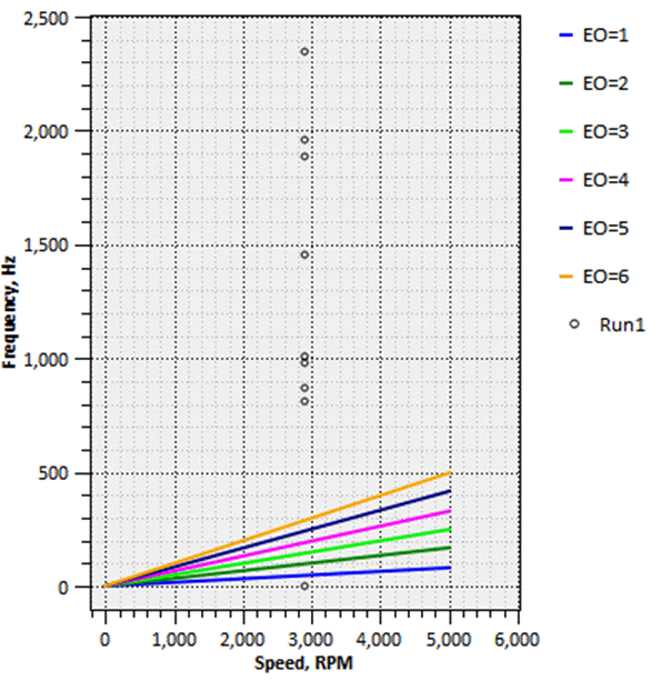For the modal analysis, TurboTides outputs Campbell and interference diagrams, which can be used to find which modes are of highest concern during operation. For this case, the first natural frequency is at a frequency far above the possible excitation frequencies this machine could experience, so during normal operation there should be no resonance. This is shown below in the Campbell diagram for this case: